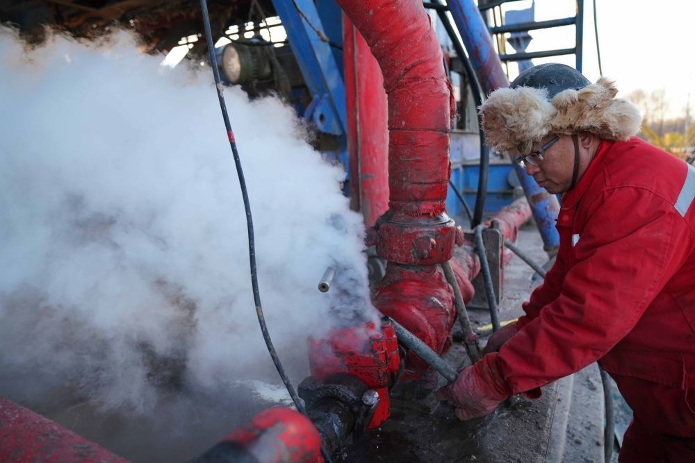 在泵罐区,泥浆工程师王波摘下手套,把手伸到一桶水中,用比重秤盛出热水,倒进设备中进行清洗作业,被水浸湿的手就这样裸露在寒风中。“这没啥的,早就习惯了!”王波笑着说。