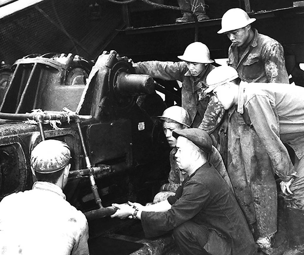 ▲王进喜带领团队研究改进泥浆泵。