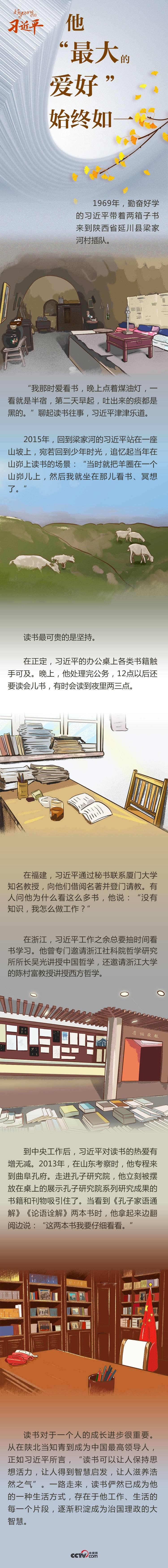 “我爱好挺多,最大的爱好是读书,读书已成为我的一种生活方式。”从梁家河窑洞里读书到中南海办公室藏书,从基层工作到治国理政,习近平始终秉持着良好的读书习惯。
