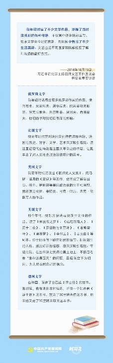 “年轻的时候,记忆力好、接受力强,应该抓紧读一些对自己终身成长具有关键性作用和决定性影响的好书。中年的时候,精力旺盛、视野开阔,应该努力拓展读书的广度和深度,打牢一生的学问基础。年老的时候,时间充裕、阅历丰富,要有锲而不舍的精神、常读常新的态度、百读不厌的劲头,在读书世界里感悟人生、乐以忘忧。”