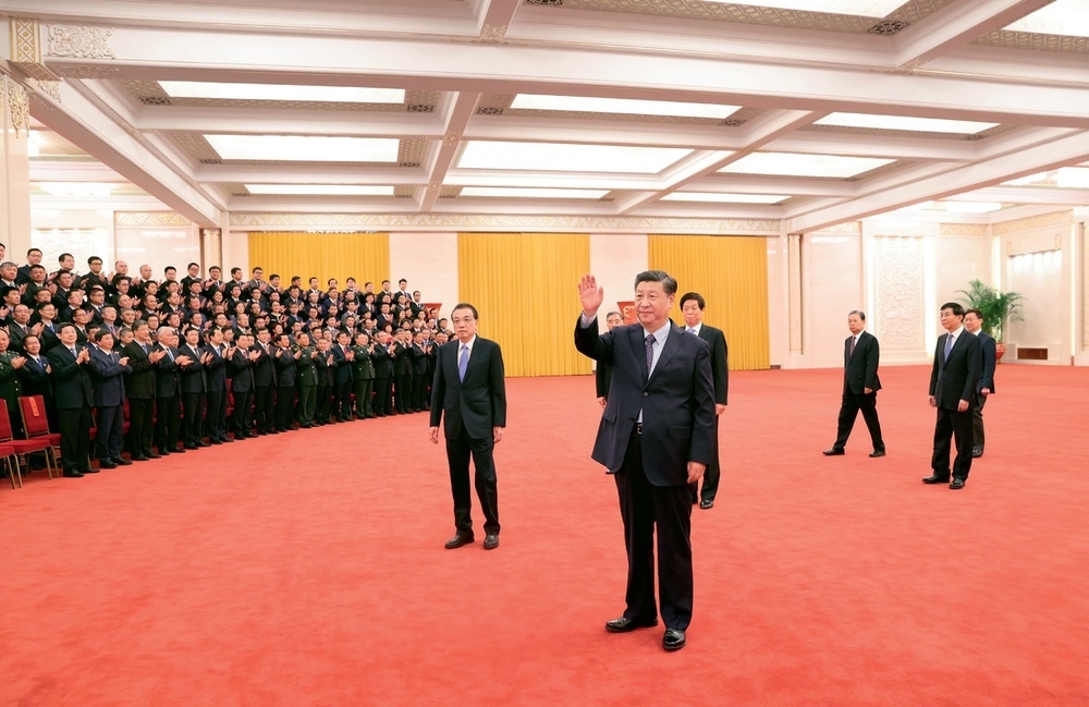 ▲ 2月22日,党和国家领导人习近平、李克强、栗战书、汪洋、王沪宁、赵乐际、韩正等在北京人民大会堂会见探月工程嫦娥五号任务参研参试人员代表并参观月球样品和探月工程成果展览。这是习近平等会见探月工程嫦娥五号任务参研参试人员代表 王晔摄/本刊