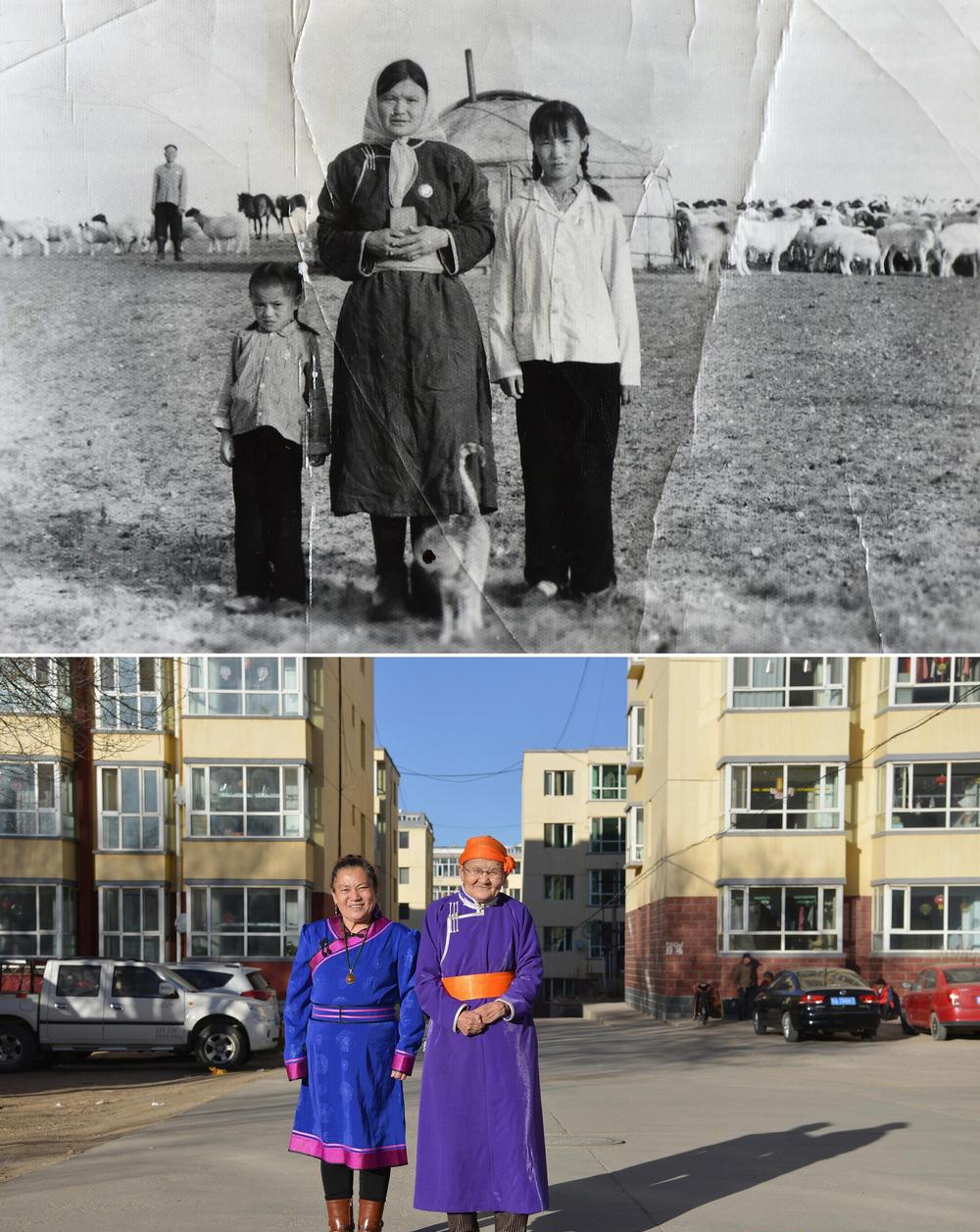 △上图:在内蒙古四子王旗脑木更苏木乌兰希热嘎查,都贵玛(中)和女儿查干朝鲁(左)在她们居住的蒙古包前合影;下图:2018年在内蒙古四子王旗乌兰花镇,76岁的都贵玛(右)和女儿查干朝鲁(左)在自家楼下合影。