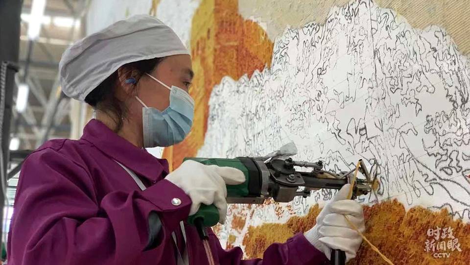 △这幅手工枪刺藏毯以长城为原型,面积接近14平方米。两人同时操作需两个月时间完成。(总台央视记者王鹏飞、杨松涛拍摄)