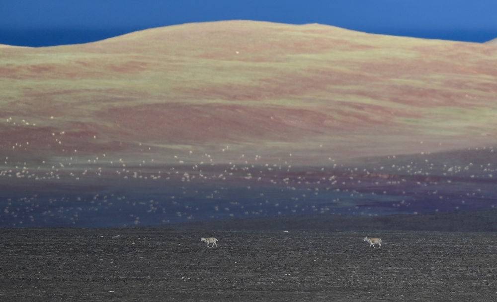 在可可西里卓乃湖区域拍摄的藏羚羊群。