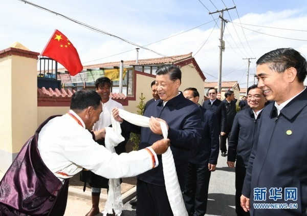 6月7日至9日,中共中央总书记、国家主席、中央军委主席习近平在青海考察。这是8日下午,习近平在海北藏族自治州刚察县沙柳河镇果洛藏贡麻村考察时,藏族牧民索南才让向习近平献上哈达。新华社记者 谢环驰 摄