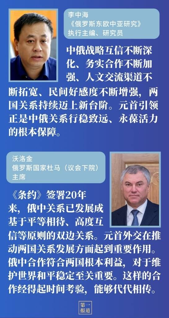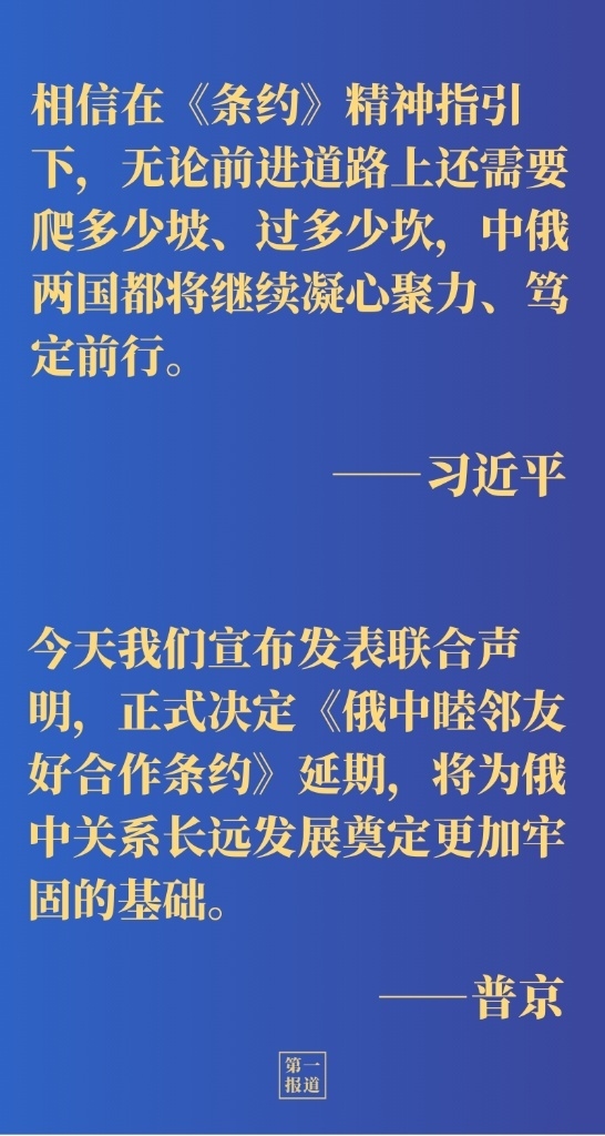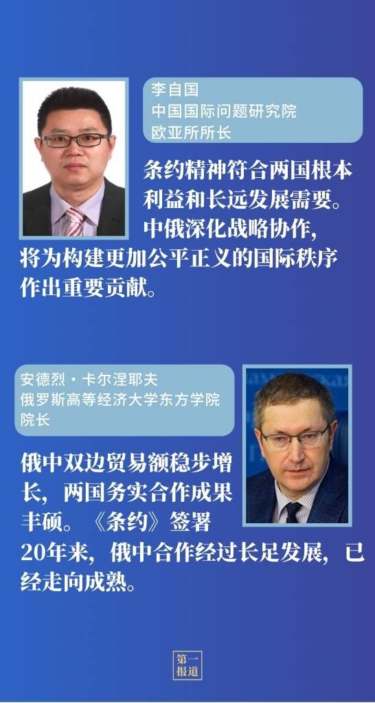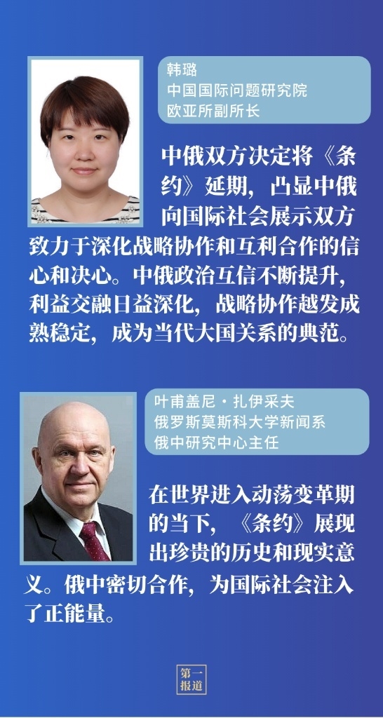 俄罗斯社会各界高度评价《条约》签署20年来在促进两国关系发展和维护世界和平稳定方面发挥的重要作用,认为两国元首宣布《条约》延期符合两国根本利益,为两国关系长远发展指明方向、注入新的动力。