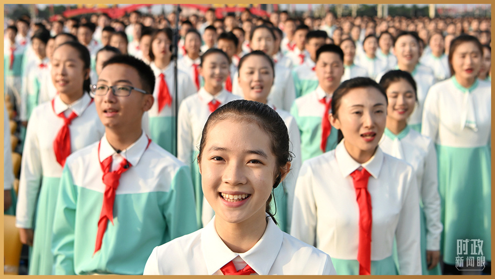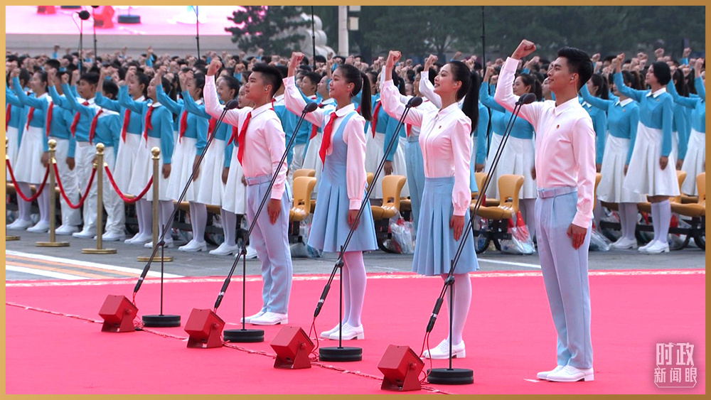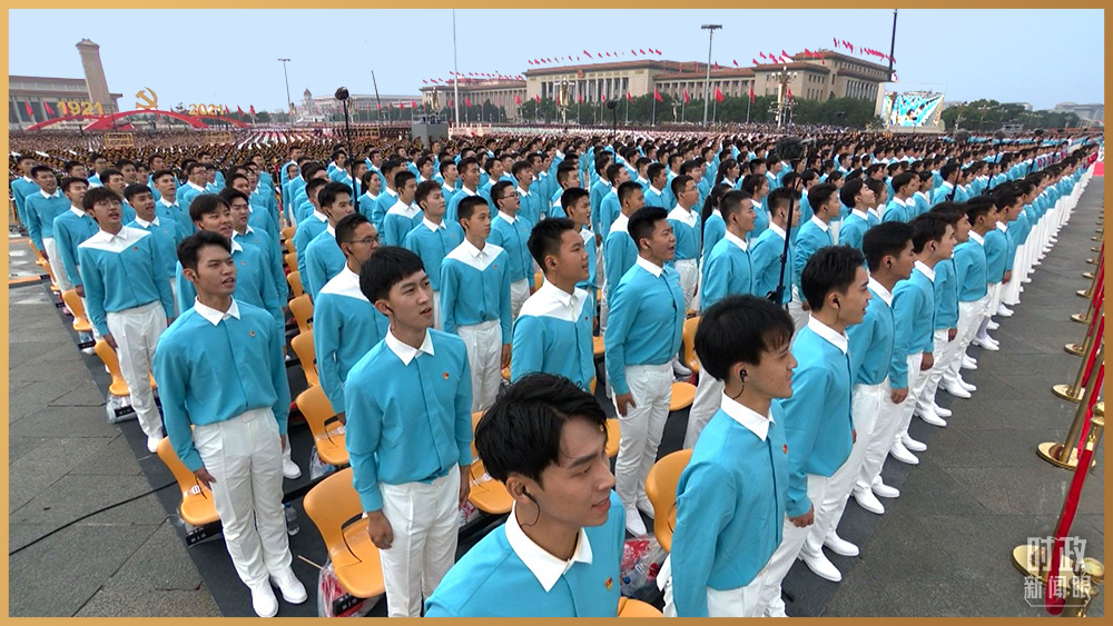 △庆祝大会现场的共青团员和少先队员代表(总台记者孙楠拍摄)