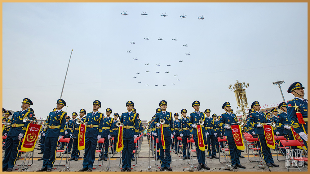 △29架直升机组成“100”字样掠过长空。(总台记者廖江衡拍摄)