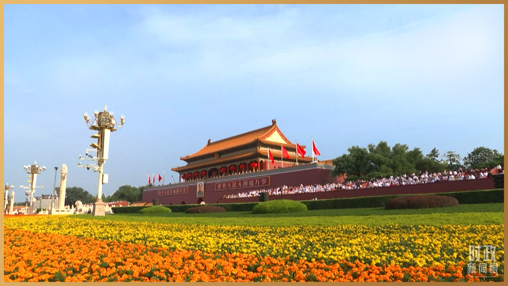△天安门广场上的中国共产党党徽和“1921”“2021”字标