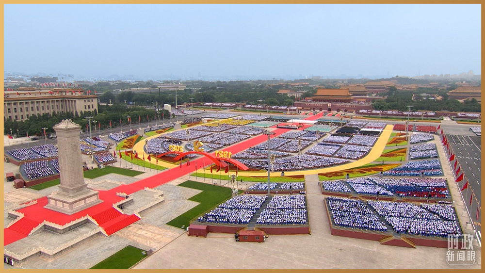 建党百年的庆祝大会,盛大而隆重。从空中俯瞰,天安门广场呈现“巨轮启航”的造型,巨轮的前甲板一直延伸到人民英雄纪念碑,高7.1米、宽7.1米的党徽在船弦上高高挺立,巨轮两侧100面红旗迎风招展。