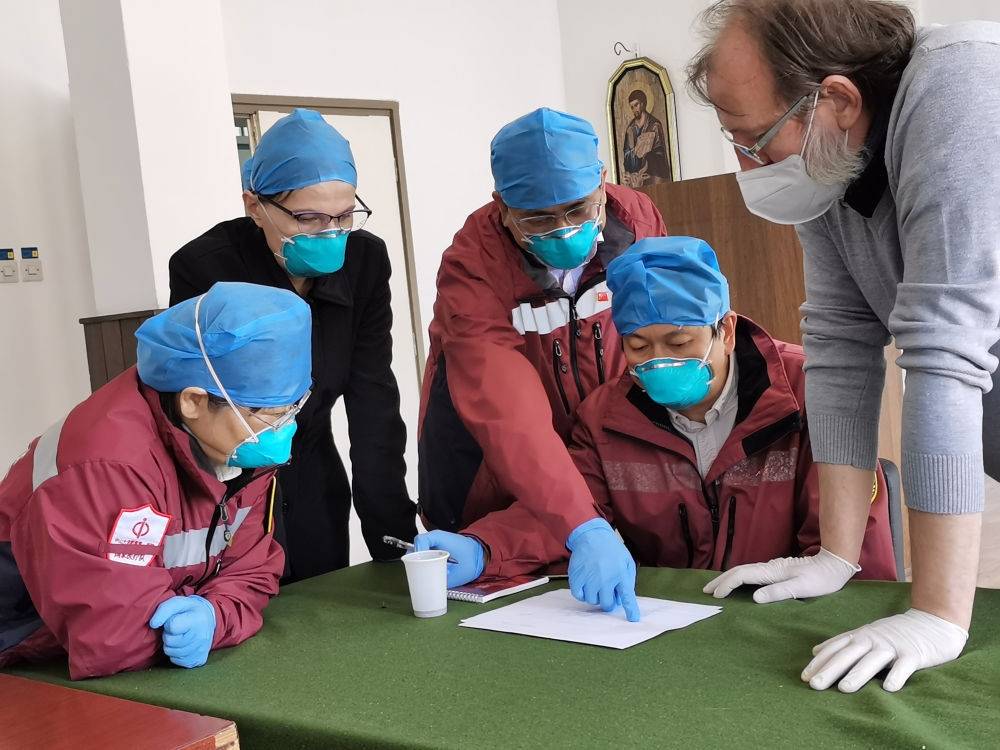 2020年4月23日,中国赴塞尔维亚抗疫医疗专家组走访塞尔维亚斯梅德雷沃市,与圣卢卡综合医院负责人(右)交流。 新华社发(专家组供图)