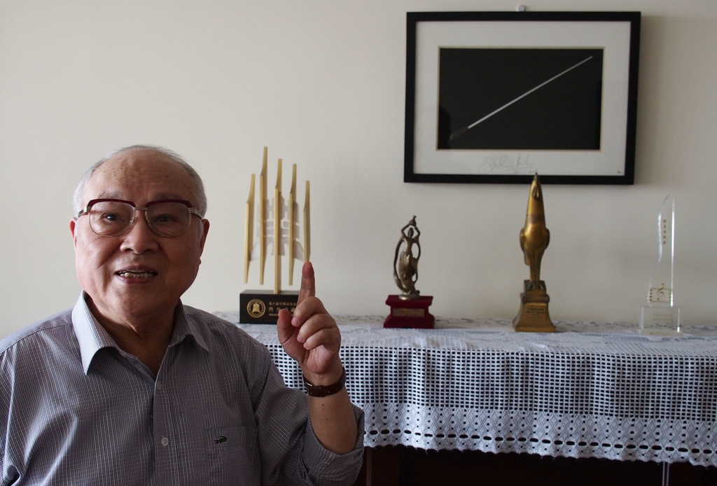 吕其明上海的家中摆放着他珍视的荣誉奖杯,墙上悬挂着的是著名指挥家祖宾·梅塔赠与他的指挥棒(2014年9月24日摄)。新华社记者任珑摄