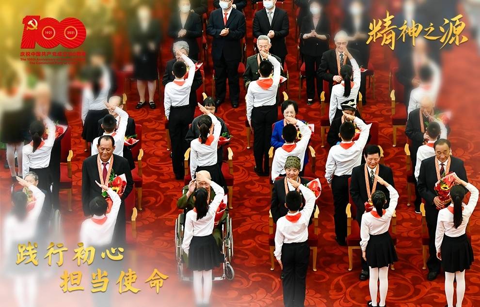 6月29日,庆祝中国共产党成立100周年“七一勋章”颁授仪式在北京人民大会堂金色大厅隆重举行。这是少先队员向勋章获得者献花,敬礼致意。
