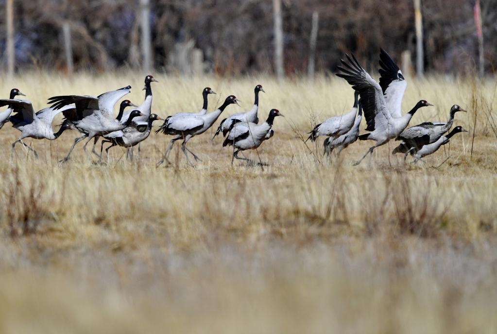 2021年2月1日,黑颈鹤从林芝市米林县雅鲁藏布江畔的农田里起飞。新华社记者 张汝锋 摄