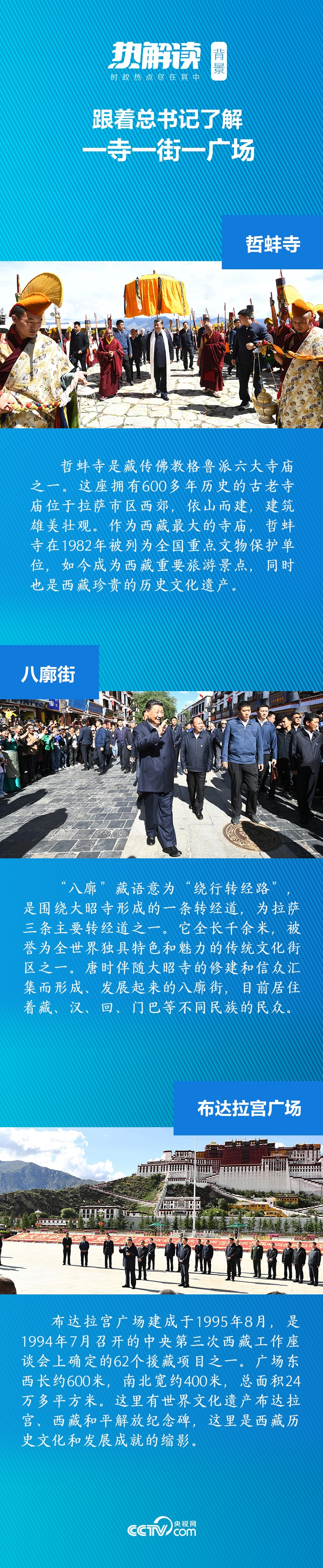 7月22日,习近平总书记先后来到位于拉萨市的哲蚌寺、八廓街、布达拉宫广场,考察民族宗教、古城保护、藏文化传承保护等工作,并同群众亲切交流。一寺一街一广场,“中华民族特色文化”是总书记此行关注的重要主题。