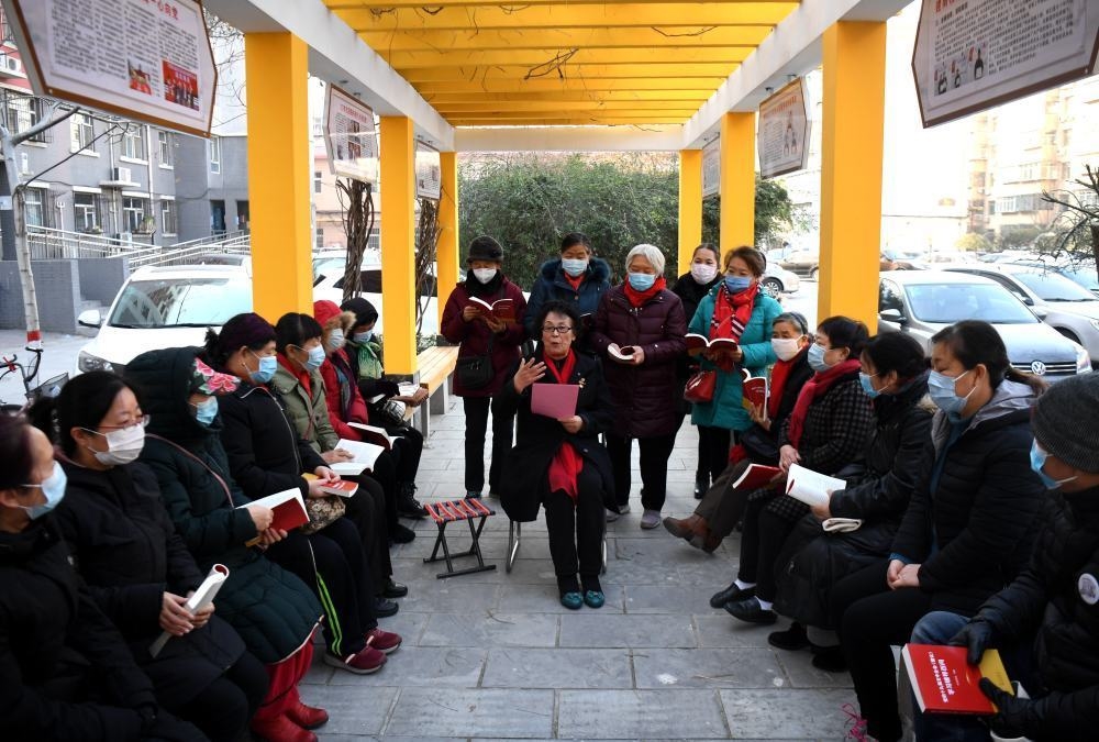 2020年12月22日,河北省石家庄市裕华区建南社区年过八十的党员靳国芳为社区居民宣讲党的十九届五中全会精神。新华社记者 王晓 摄