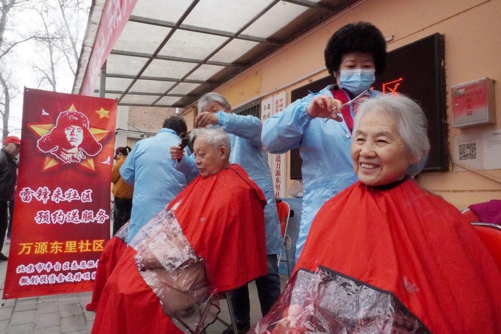 2021年3月5日,北京市丰台区东高地街道的志愿者为社区内的老人理发。新华社记者 李欣 摄