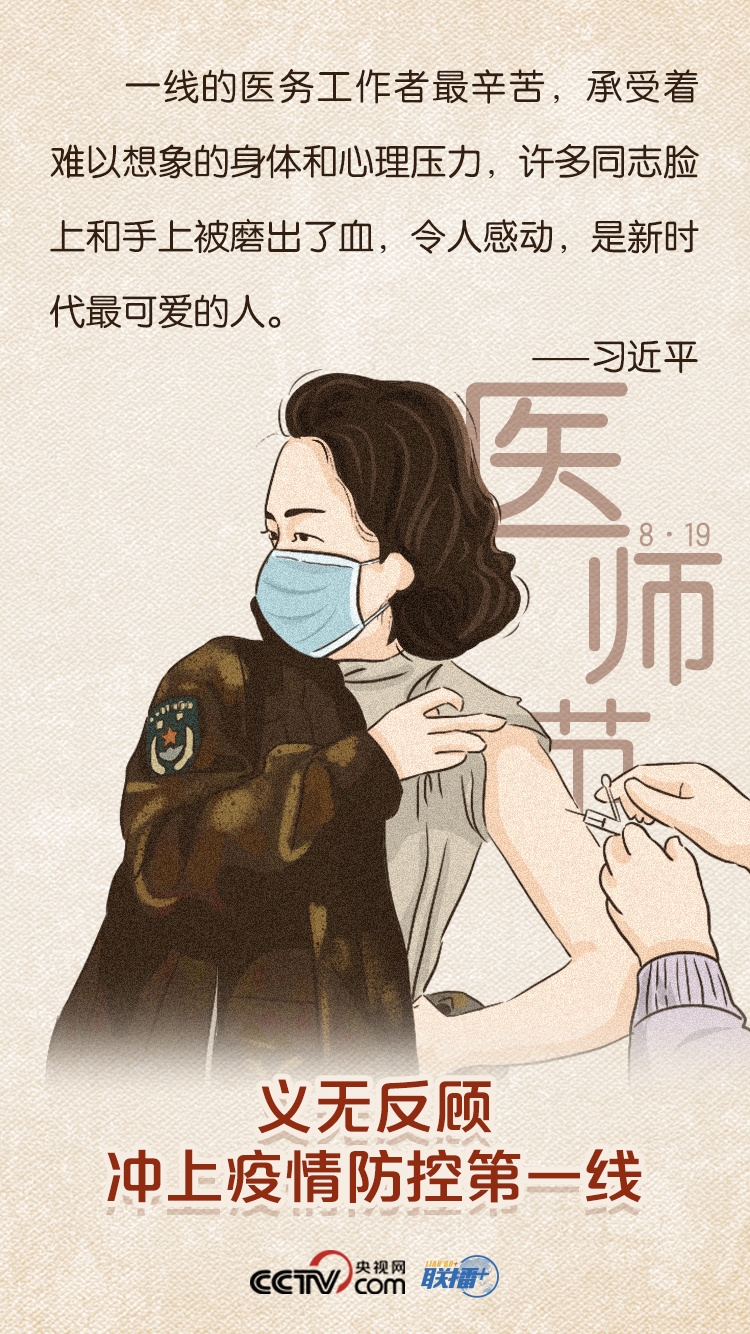 今年8月19日是第四个中国医师节,主题是“百年华诞同筑梦,医者担当践初心”。央视网《联播+》带您通过一幅幅医生救死扶伤的画面和总书记相关讲话,感受中国医师的医者仁心,致敬新时代最可爱的人。