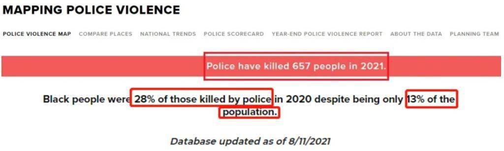 据美国“警察暴力地图”(MPV)网站统计,2020年美国警察共开枪打死1127人,只占美国总人口13%的黑人占到了被警察枪杀人数的28%。今年截至目前的最新数据显示,美国警察已经杀死657人,黑人占比仍远高于其占美国总人口比例。