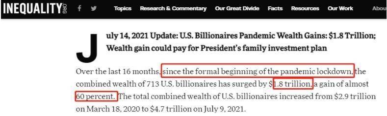 △非营利组织“INEQUALITY”网站:从去年3月到今年7月,美国713位亿万富豪的资产总和增加了1.8万亿美元,达4.7万亿,涨幅接近60%。