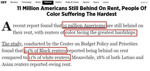 △《国际财经时报》(IBT)网站:近期报告显示,美国仍有1100多万成年人无力按时缴纳房租,少数族裔面临的困难尤甚,有24%的黑人租户拖欠租金,而白人租户拖欠租金的比例仅为11%。