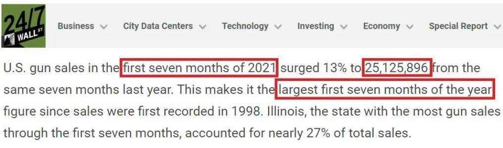 美媒发布的最新数据显示,今年仅前7个月,美国枪支销量就已超过2500万支,创下1998年有记录以来的同期最大销量。