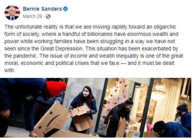对此,美国无党派联邦参议员伯尼·桑德斯曾撰文称,贫富不均是美国面临的重大道德、经济和政治危机。“我们正迅速走向寡头政治,少数亿万富豪拥有巨大的财富和权力,而工薪家庭却在以自大萧条以来从未见过的方式挣扎”。