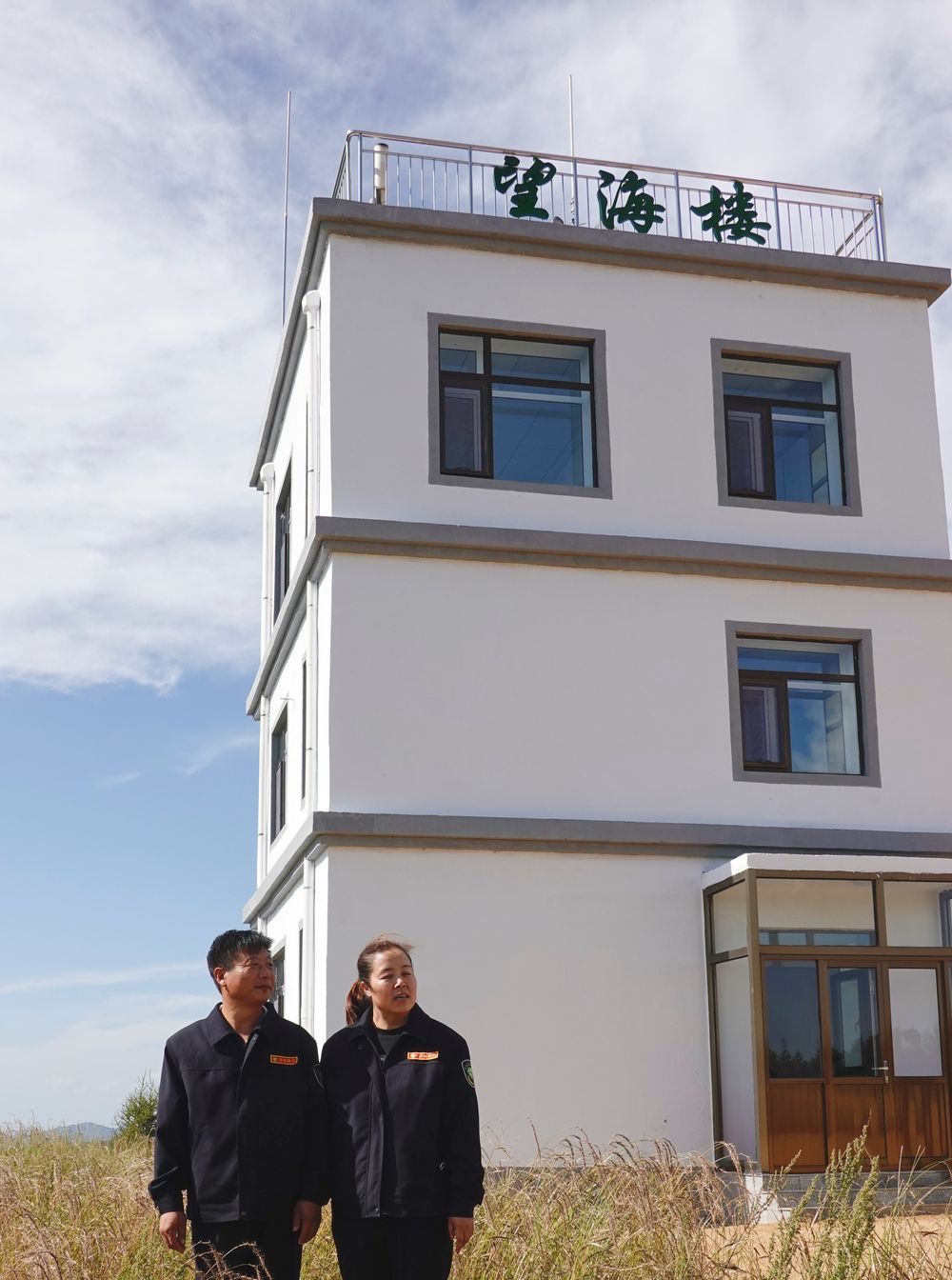 ↑护林员刘军(左)、王娟在塞罕坝机械林场望海楼前(2021年8月23日摄)。在13年的坚守中,刘军、王娟夫妇用常人难以想象的辛勤付出守护林场安全。