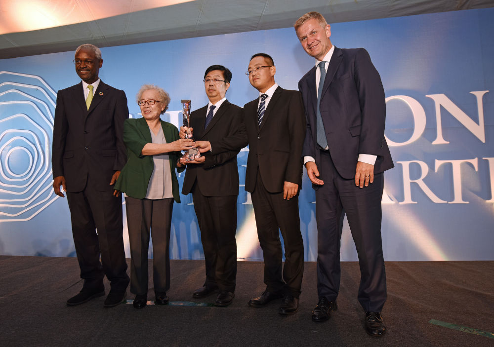 ↑在肯尼亚内罗毕联合国环境规划署总部,老、中、青三位塞罕坝人陈彦娴(左二)、刘海莹(中)、于士涛(右二)领取2017年联合国环保最高荣誉——“地球卫士奖”(2017年12月5日摄)。