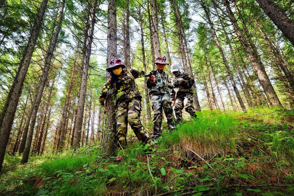 ↑工作人员行走在塞罕坝机械林场(2017年7月14日摄)。