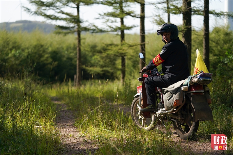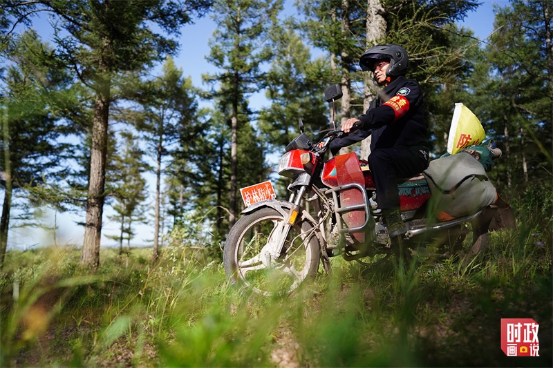 护林员辛长福骑着摩托车在林场中穿行。林子就像孩子,呵护它长大,慢慢成了很多人生命的一部分。