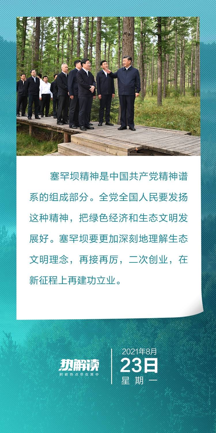 8月23日,习近平总书记赴塞罕坝机械林场考察。在塞罕坝精神发源地、百万亩林海起源地——尚海纪念林,总书记同林场职工代表亲切交流,鼓励他们“再接再厉,二次创业,在新征程上再建功立业”,勉励全党全国人民发扬塞罕坝精神,“把绿色经济和生态文明发展好”。