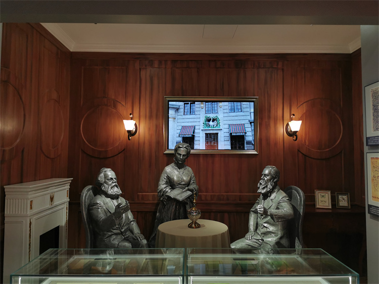 有了教学馆,学员们不仅可以坐着听,还必须站起来、走起来、看起来,不仅动眼、动耳、动嘴,还要动手、动脚、动脑。课堂上、书本中的经典著作看起来深奥、高冷的理论“范儿”,因为有了“场景”的植入与催化,以及学员的主动参与而变得“很酷、很潮”,进而变得“活”起来。比如,第一展厅重点展示了比利时白天鹅咖啡馆的场景,再现马克思和恩格斯当年结下深厚友谊、联手研究撰写《共产党宣言》的历史情境。情境中,马克思、恩格斯正在研讨,燕妮则认真倾听、记录。教学团队讨论这个场景复原设计时,国防大学政治学院马克思主义理论系教授高民政提出,《共产党宣言》本身就出自青年人之手,书写了无产阶级政党的青春之歌,是无产阶级政党的青春宣言,我们的场景设计也要体现出这样的时代气息。