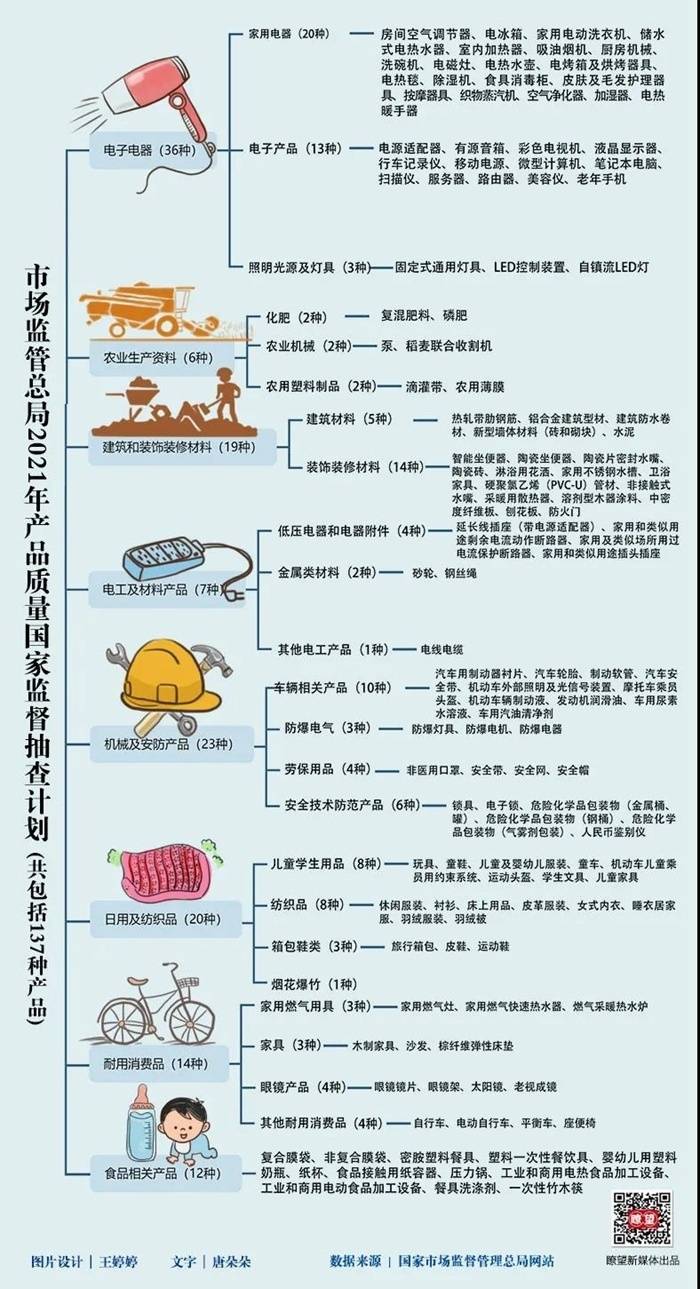 ◆ 按照产品质量国家监督抽查计划,全国市场监管部门今年将抽查包括36种电子电器在内的137种重点产品,突出流通领域产品、民生产品、“一老一小”产品的抽查,服务儿童、学生、老人等特殊群体生活学习需求,还针对电线电缆、水泥、农用地膜等重要产品,在产业集中区等重点区域,开展全国联动抽查