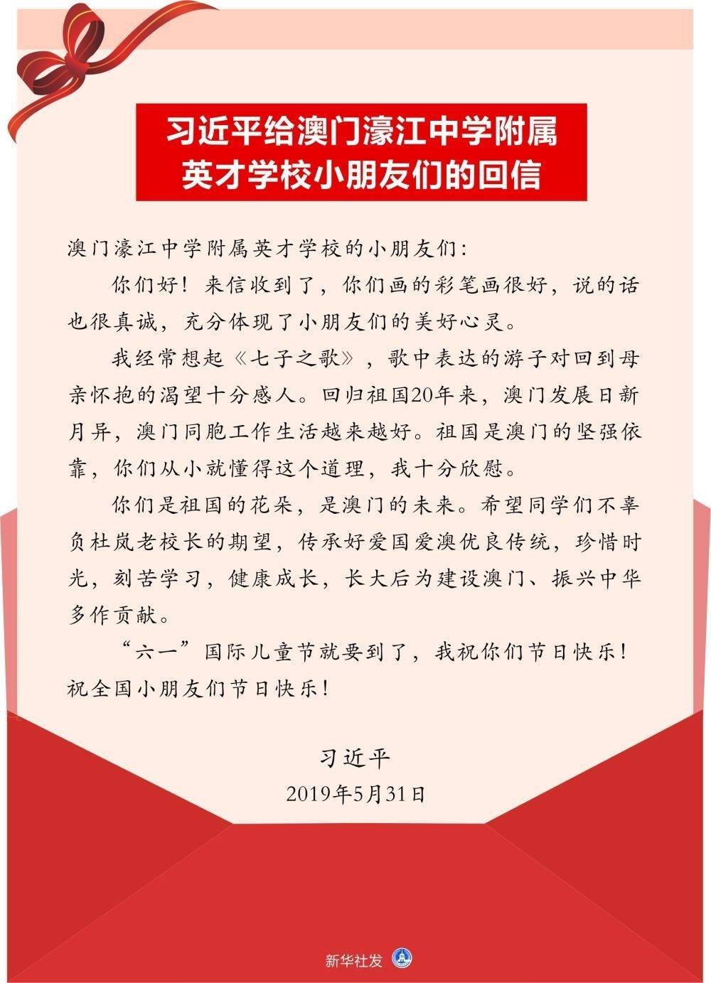 ↑习近平给澳门濠江中学附属英才学校小朋友们的回信。新华社发
