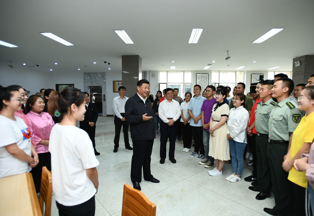 ↑2019年7月16日,习近平在内蒙古大学图书馆同学生们亲切交谈,勉励他们志存高远、脚踏实地、发奋图强。