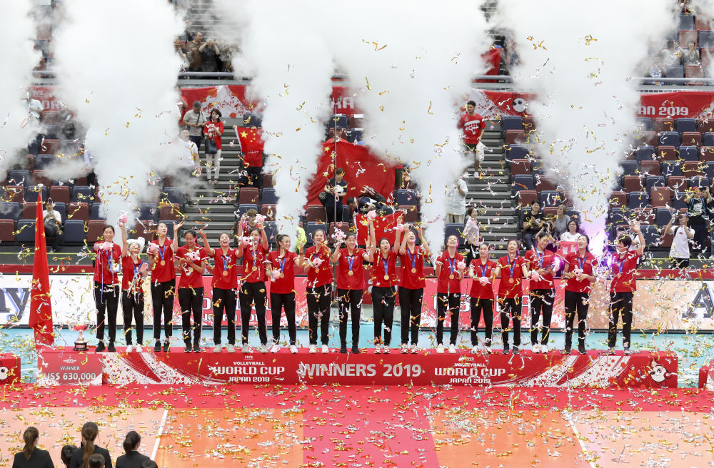 2019年9月29日,第十三届女排世界杯颁奖仪式在日本大阪举行,中国队在本届比赛中以十一连胜的战绩夺得了冠军。新华社记者杜潇逸摄
