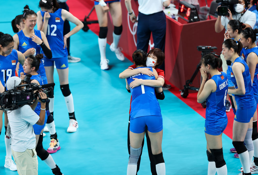 2021年8月2日,中国队主教练郎平在比赛后与队员一一拥抱。当日,在东京奥运会排球项目女排小组赛中,中国队以3比0战胜阿根廷队。新华社记者丁汀摄