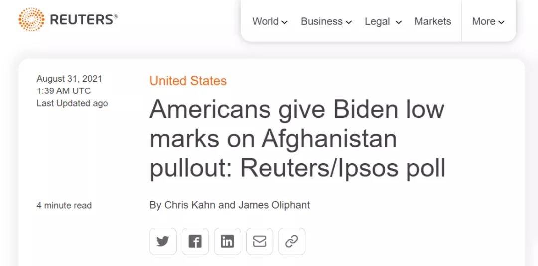 阿富汗撤军,一地鸡毛,也让拜登支持率跌至上台以来最低。路透社与益普索的联合调查显示,拜登的支持率下降了七个百分点,只有46%的美国成年人认可拜登在任时的表现。