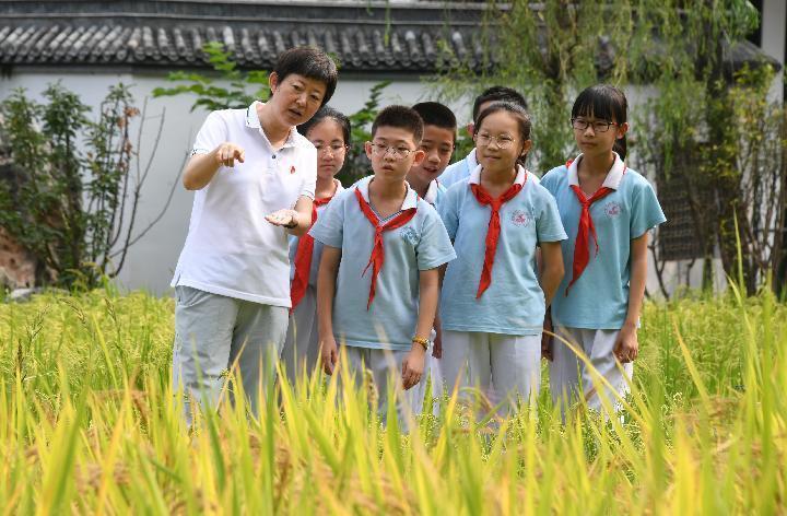 一片黄灿灿的稻田,一束束颗粒饱满的稻穗,很难想象这样的景象并非出现在乡间,而是在北京市八一学校校园内。