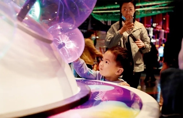 ▲ 5月23日,位于上海浦东新区的上海科技馆迎来众多参观者。这是小朋友用手触摸辉光球表面 方喆摄