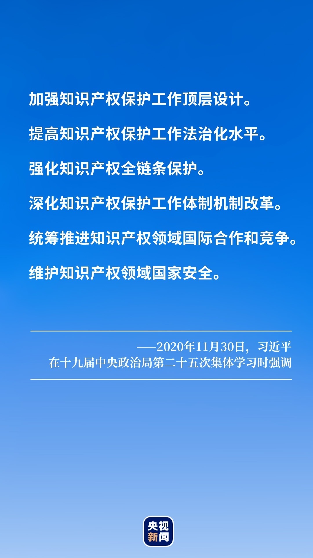 “更大力度加强知识产权保护国际合作。”“为了更好运用知识的创造以造福人类,我们应该共同加强知识产权保护,而不是搞知识封锁,制造甚至扩大科技鸿沟。”