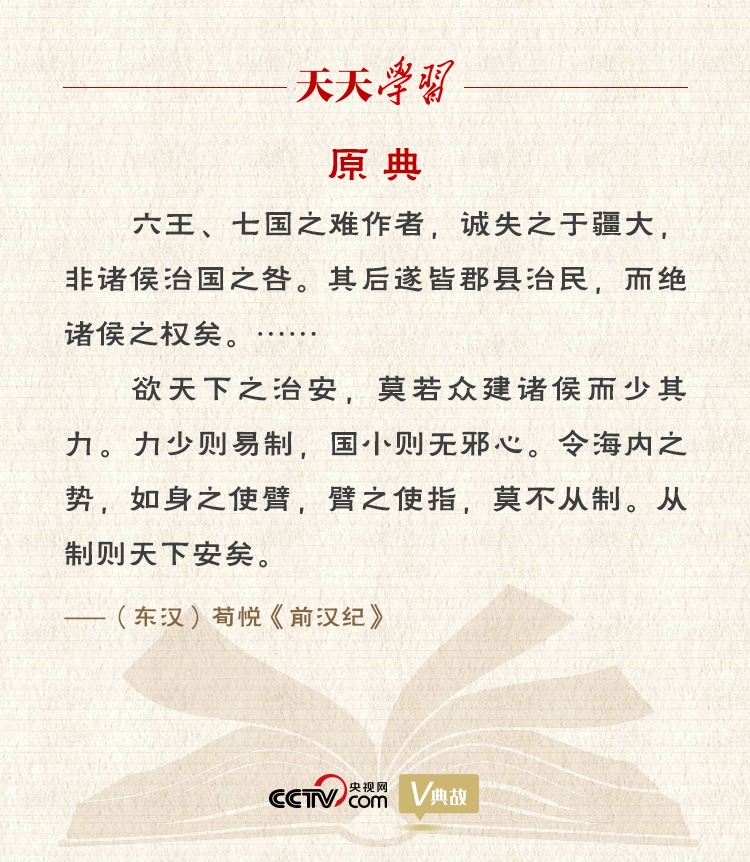 在“前汉孝惠皇帝纪卷第五”中,荀悦谈及郡县制:“六王、七国之难作者,诚失之于疆大,非诸侯治国之咎。其后遂皆郡县治民,而绝诸侯之权矣。”接着,在“前汉孝文皇帝纪上卷第七”中,他又进一步申论道:“欲天下之治安,莫若众建诸侯而少其力。力少则易制,国小则无邪心。令海内之势,如身之使臂,臂之使指,莫不从制。从制则天下安矣。”这两段话,后人引申为:“郡县治民,从制则天下安矣。”进而又精简为“郡县治,天下安”,意思是说,以郡县结构的方式治理国家就天下安宁了。我们今天在引用这句话时,主要指的是县级行政单位,强调治国当治县,治理好县域,天下就能太平。