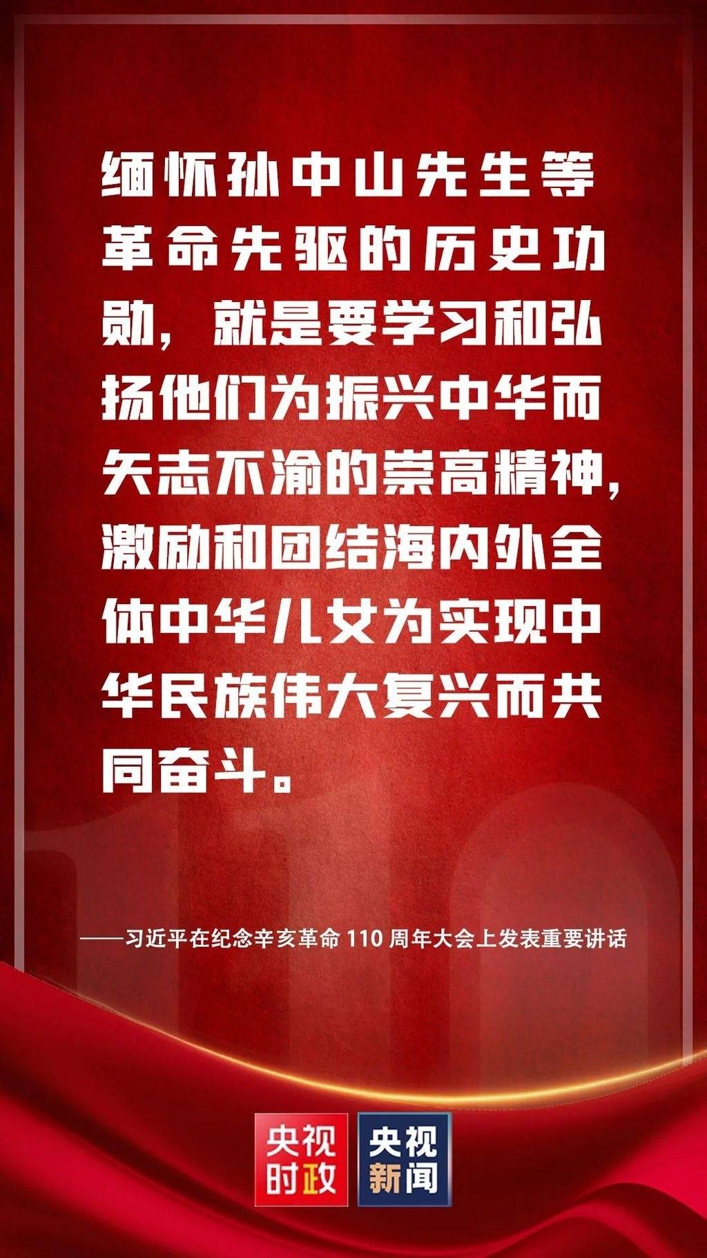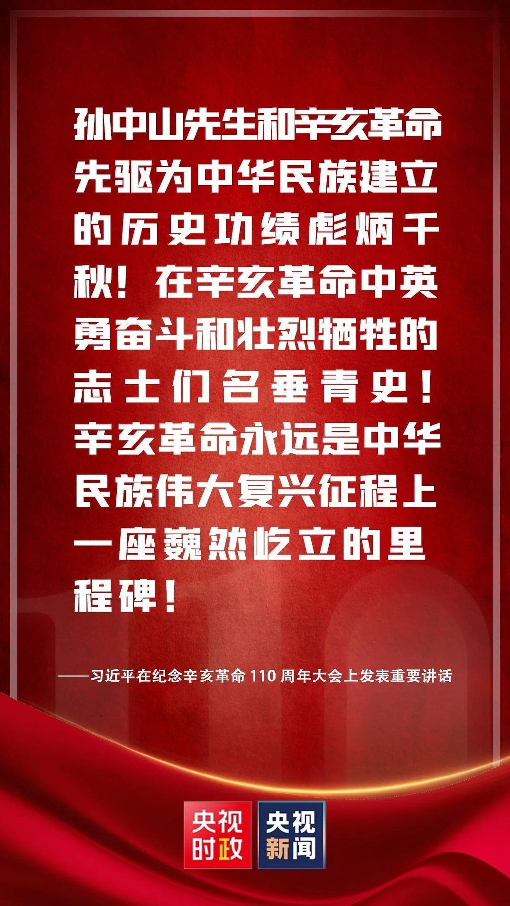 纪念辛亥革命110周年大会于10月9日上午10时在北京人民大会堂隆重举行。中共中央总书记、国家主席、中央军委主席习近平出席大会并发表重要讲话。