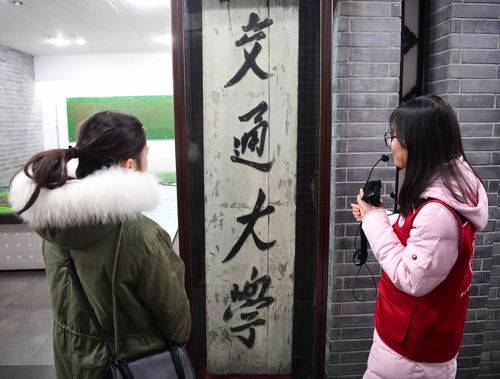 △2018年1月2日,学生在西安交大西迁历史纪念馆参观1956年由上海运至西安的交通大学校牌。新华社记者 邵瑞 摄