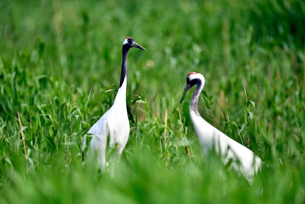 ↑两只丹顶鹤在水草间栖息。新华社记者 郭绪雷 摄