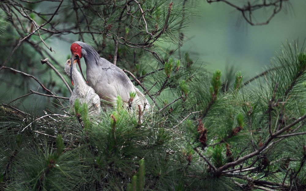 ↑在陕西省洋县龙亭镇梁河村一处密林里,一只成鸟朱鹮为幼仔喂食(5月21日摄)。 新华社记者 陶明 摄