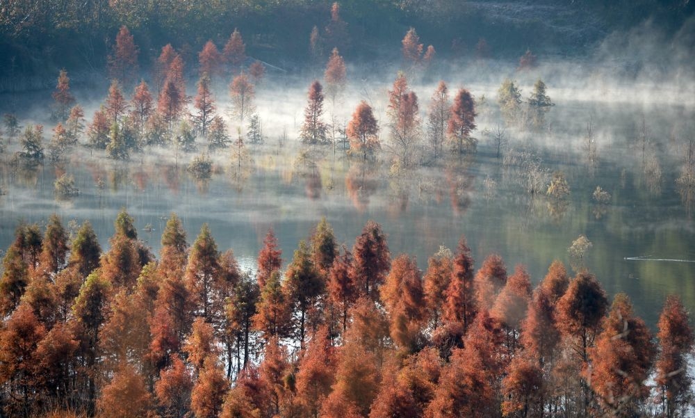 ↑水鸟游过清晨薄雾中的云南省昆明市盘龙区滇源街道甸尾村水杉湿地(资料照片)。 新华社记者 秦晴 摄