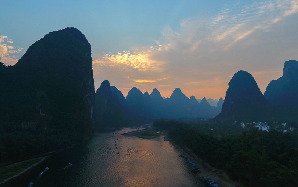 ↑广西桂林市阳朔县兴坪镇漓江景色(2017年10月25日摄,无人机照片)。新华社记者 黄孝邦 摄