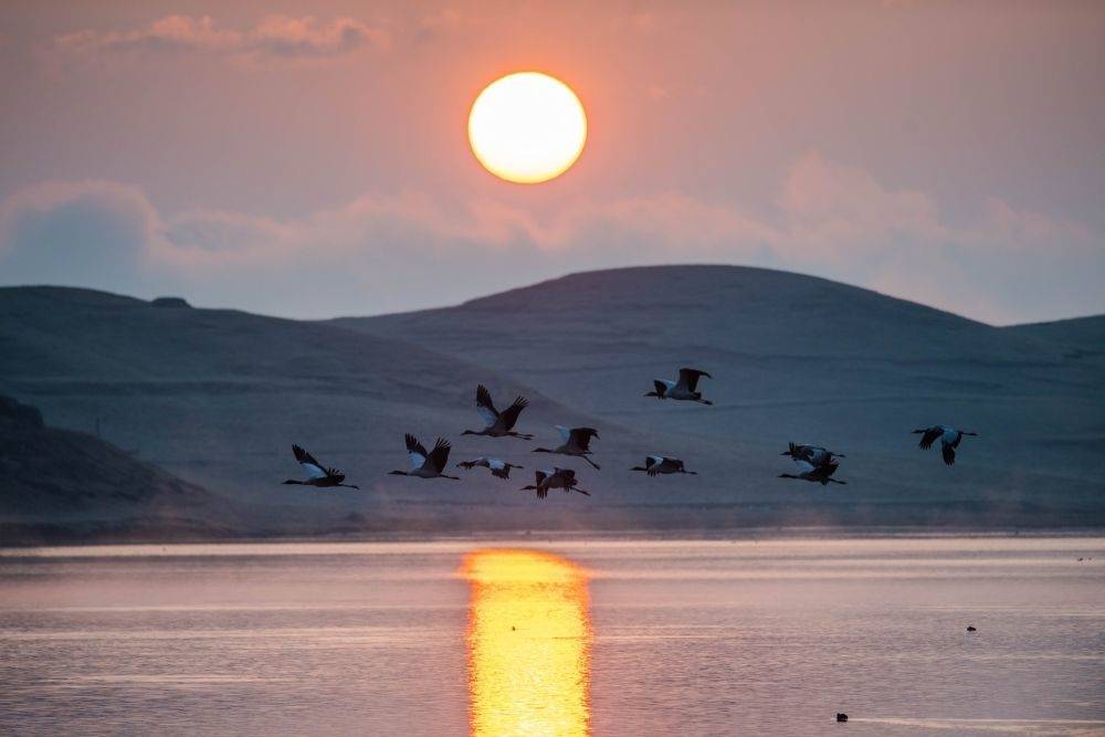 ↑日出时分,黑颈鹤在云南省昭通市大山包黑颈鹤国家级自然保护区飞翔(2月25日摄)。 新华社记者 胡超 摄